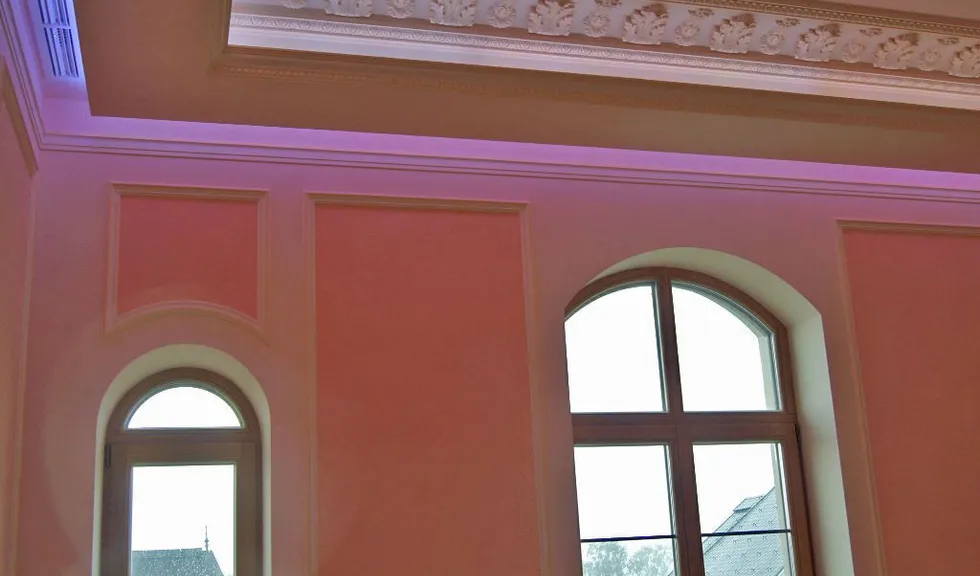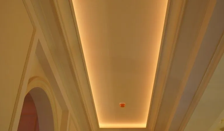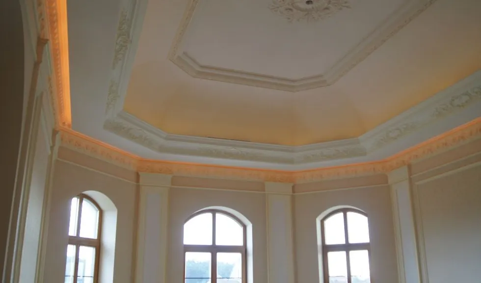 Светодиодное освещение было установлено в загородном доме, интерьер которого выполнен в классическом стиле. Декоративная контурная подсветка, установленная за полиуретановыми карнизами, придала внутренней обстановке дома сказочность и неповторимость.
