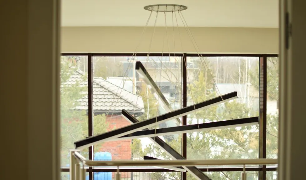 Высота потолка зала в области лестничного пролёта позволила установить объемный светильник, созданный из алюминиевых профилей и подвесов. Подвесы отрегулированы таким образом, что профили находятся на разных уровнях под наклоном. Конструкция получилась объемной, но в то же время лёгкой, что подчеркнуло общий стиль интерьера зала.