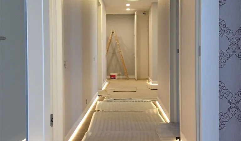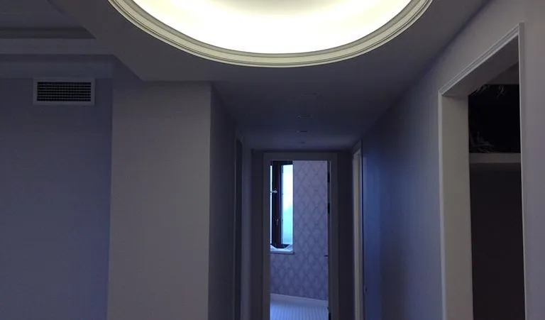 Для освещения прихожей и большого коридора были использованы встраиваемые светодиодные светильники arlight®. Они обеспечивают яркое освещение но при этом потребляют мало электроэнергии. В коридоре также была организована подсветка пола, для этого светодиодная лента была установлена в плинтус и затем закрыта матовым экраном для создания эффекта линий света.