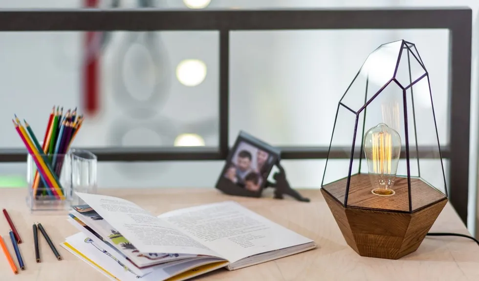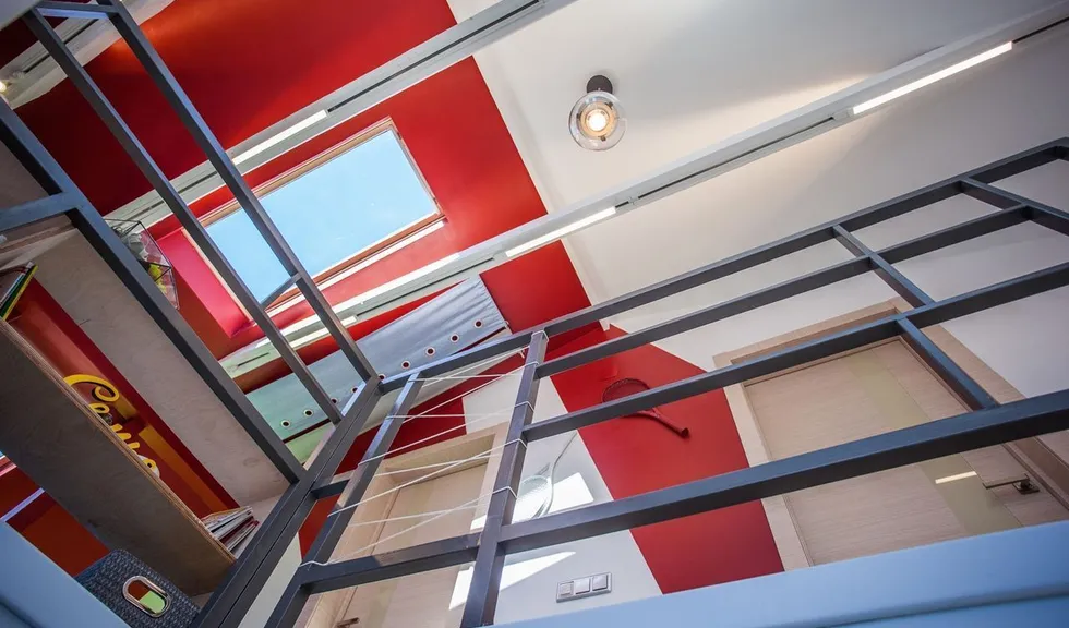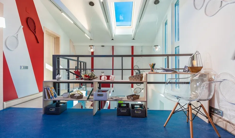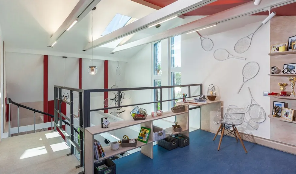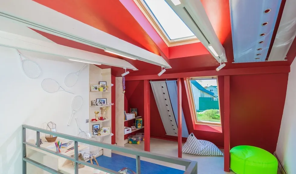 Объектом переделки стали две комнаты в загородном доме, расположенные на двух этажах. Часть перекрытий была убрана, в крыше появилось множество больших окон. Объединённое помещение стало просторным, воздушным и светлым. Светлым и днём, и в тёмное время суток благодаря светодиодным светильникам разных типов.