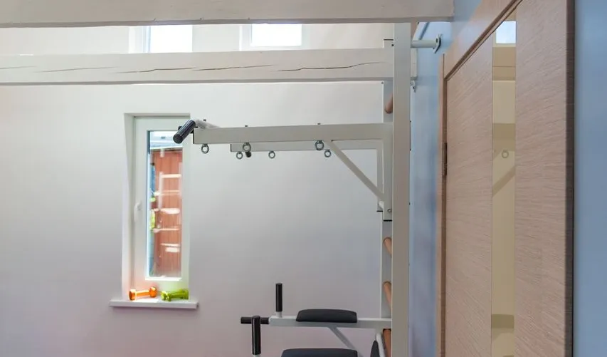 Из двух, расположенных одна над другой, комнат, дизайнеры и мастера телепроекта «Фазенда» на Первом канале сделали просторный спортивный зал. Он получился светлым не только благодаря открывшемуся пространству и большим окнам, но и множеству светодиодных светильников.