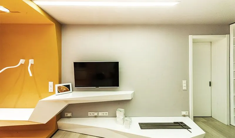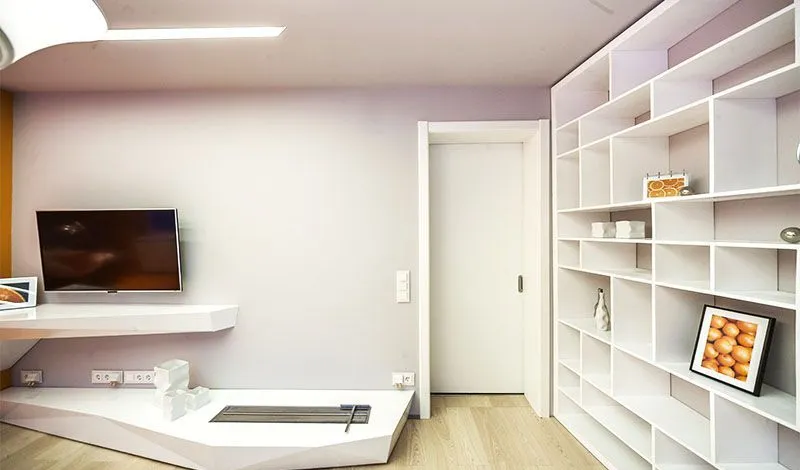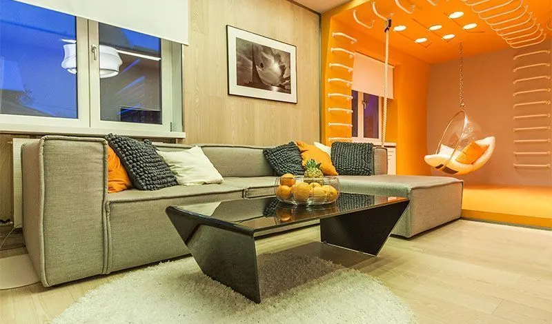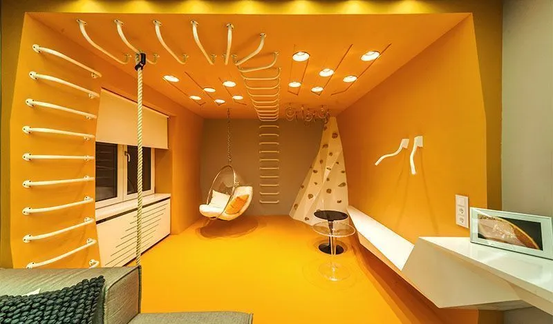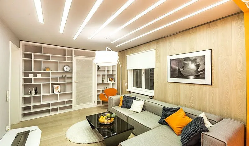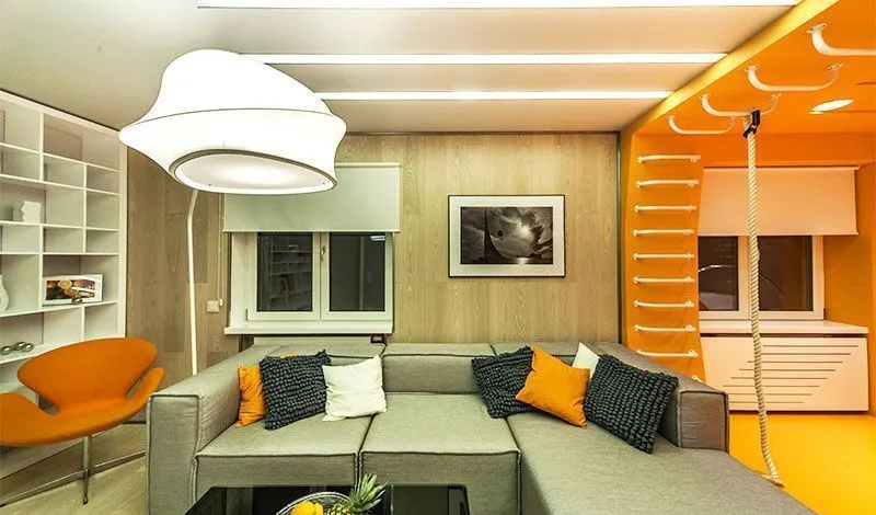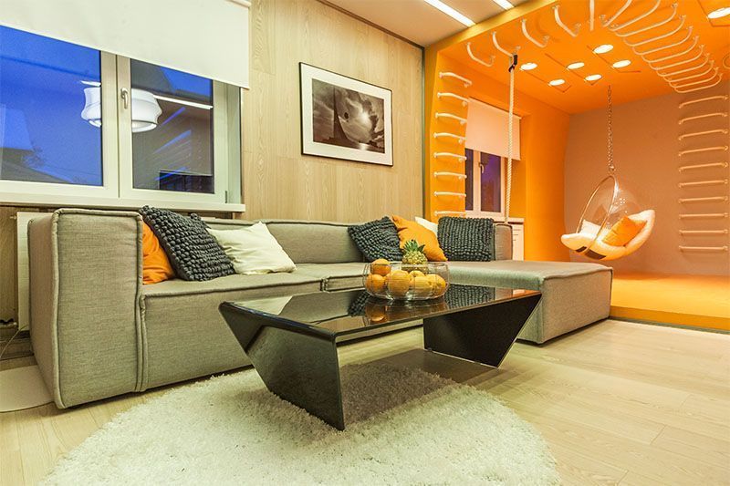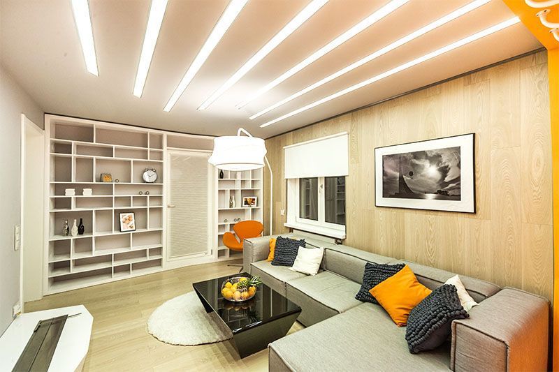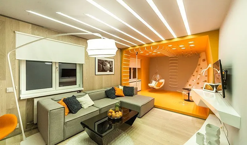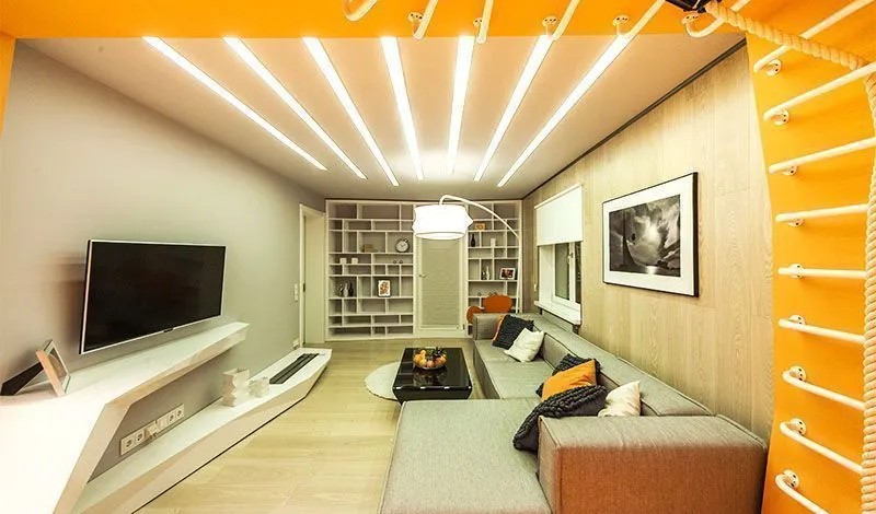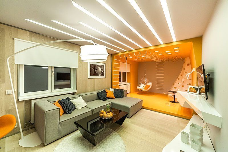 Контраст между двумя зонами подчеркнут и освещением: в потолок спортивной зоны утоплены функциональные светодиодные светильники-споты arlight®, а в потолок над зоной отдыха встроены эффектные световые полосы, которые служат основным источником света.Полосы сделаны на основе светодиодной ленты arlight®, установленной в алюминиевый профиль и закрытой матовым экраном для создания эффекта мягкой непрерывной световой линии. В комнате также появились локальные источники света: торшер и гибкие бра.