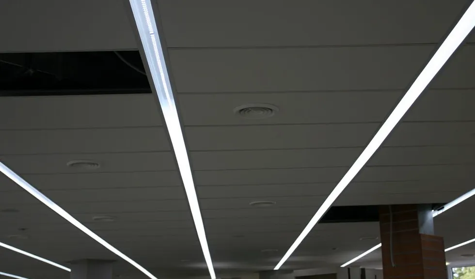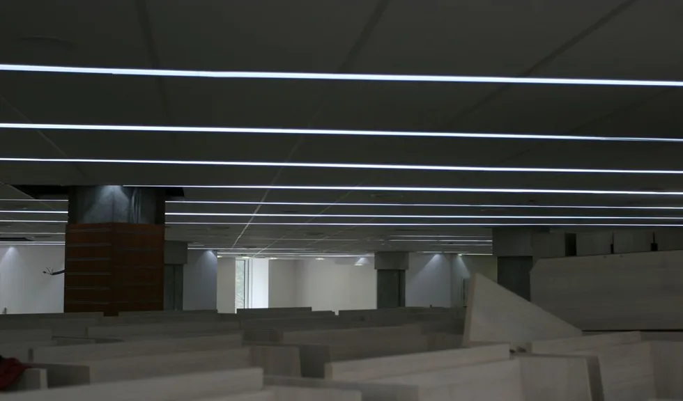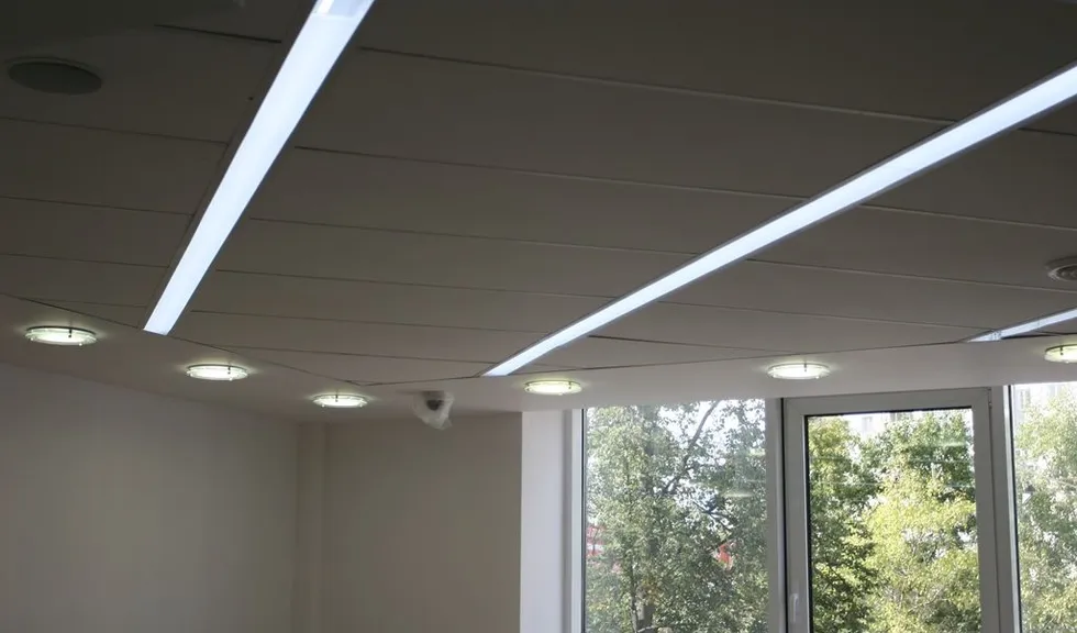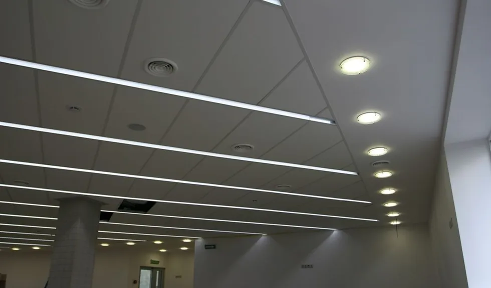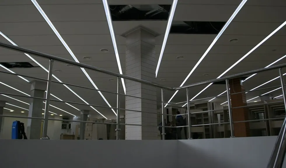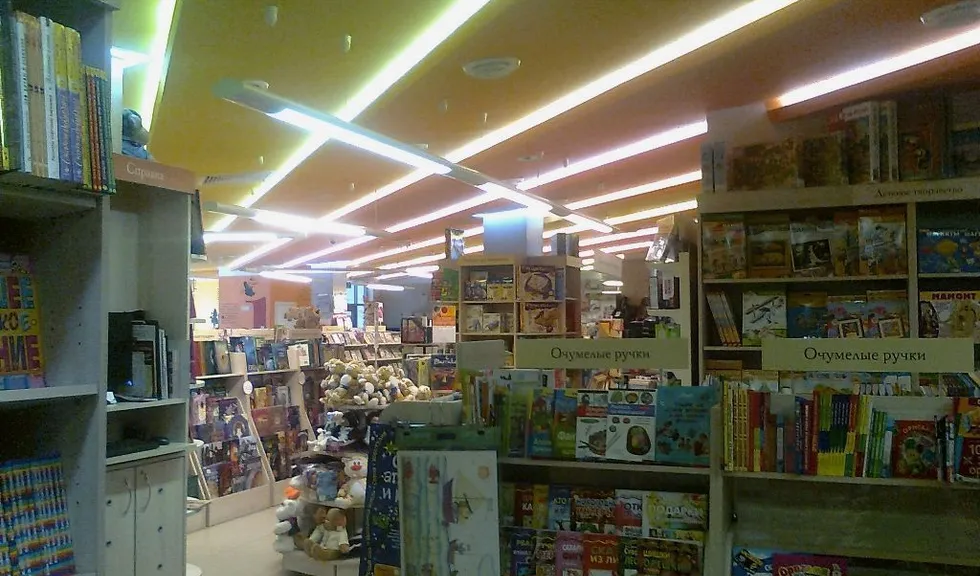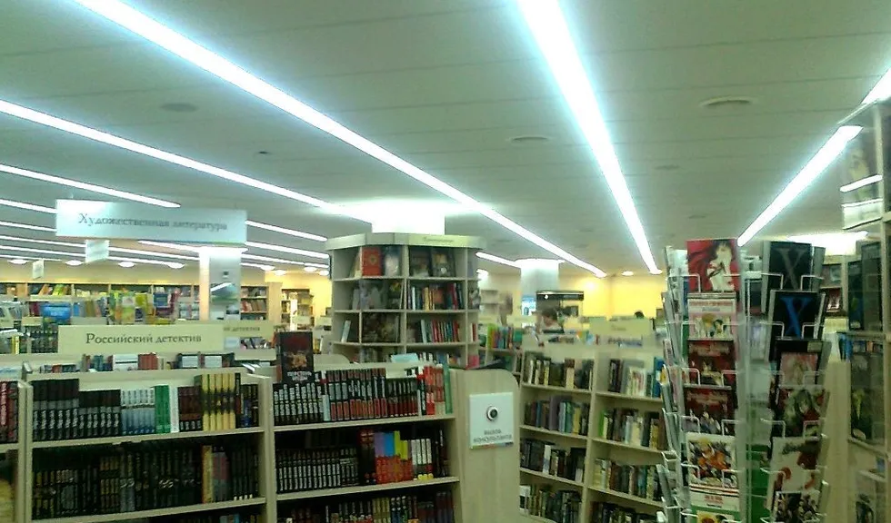 Светодиодное освещение торговых площадей в книжном магазине было выполнено двумя способами. Первый - освещение многоуровневого гипсокартонного потолка, второй - линейные светильники с матовым стеклом, встроенные в потолок Армстронг. Эти светильники создали эффект равномерных световых линий. В обоих вариантах освещения применялось светодиодная продукция торговой марки arlight®.
