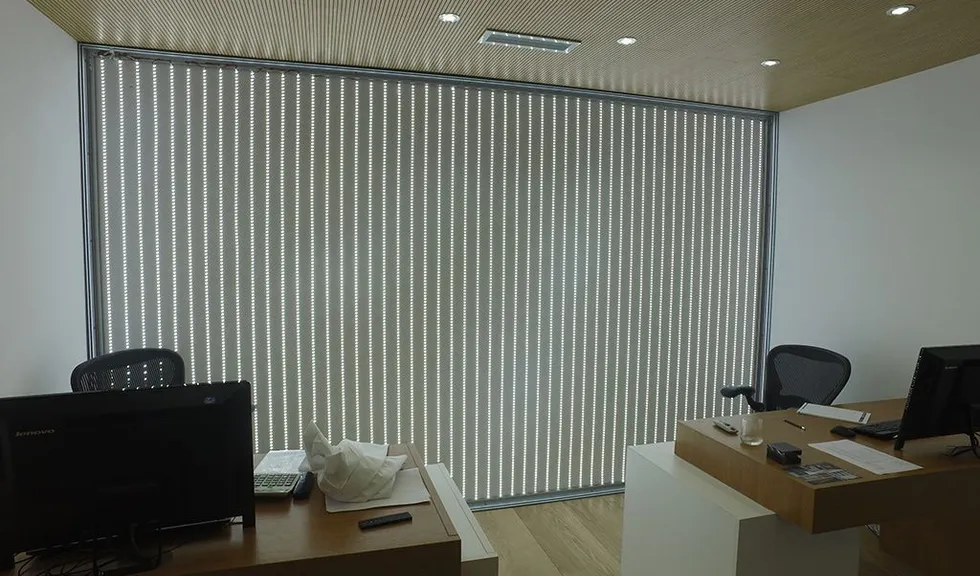 Вторая задача - сплошная засветка светопропускающего полотна. Для этого специалисты рассчитали оптимальное расстояние между светодиодными лентами, разметили места монтажа, подготовили поверхность и установили ленту. Всю светодиодную ленту подключили к диммеру и усилителям, чтобы иметь возможность регулировать яркость освещения. После завершения монтажа ленты и проверки системы, поверх было натянуто светопропускающее полотно, которое создало эффект полностью и равномерно светящейся стены.