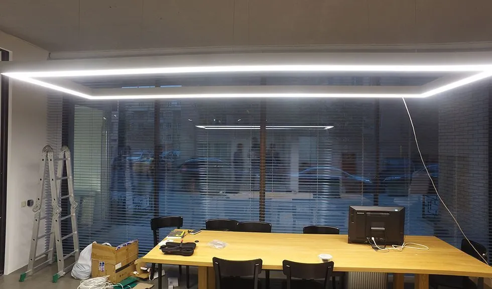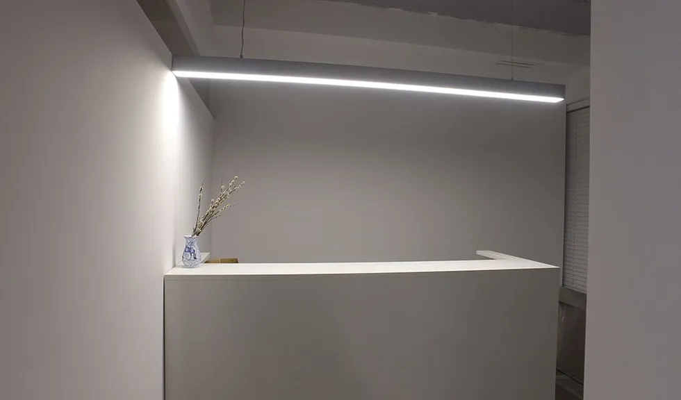 Для освещения стойки приёмной (ресепшена) использован один цельный профиль, установленный на подвесы. В конференц-зале решение более интересное: профили объединены в единую подвесную конструкцию прямоугольной формы. Для этого концы профилей были срезаны под углом 45 градусов для их плотной стыковки и скреплены между собой специальными соединителями. Светильник получился ярким и эффектным - не в последнюю очередь благодаря матовому экрану, превращающему свечение в единую линию света.