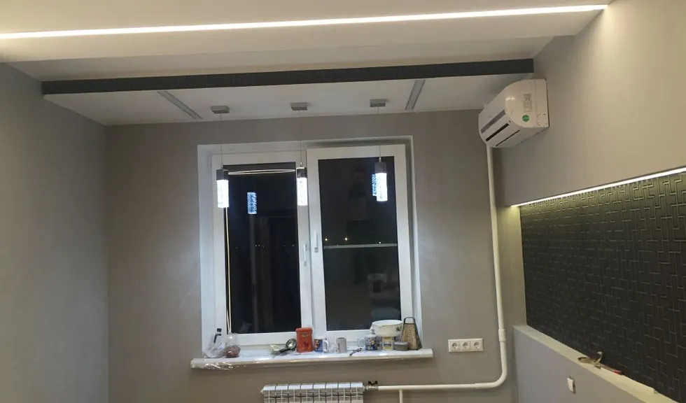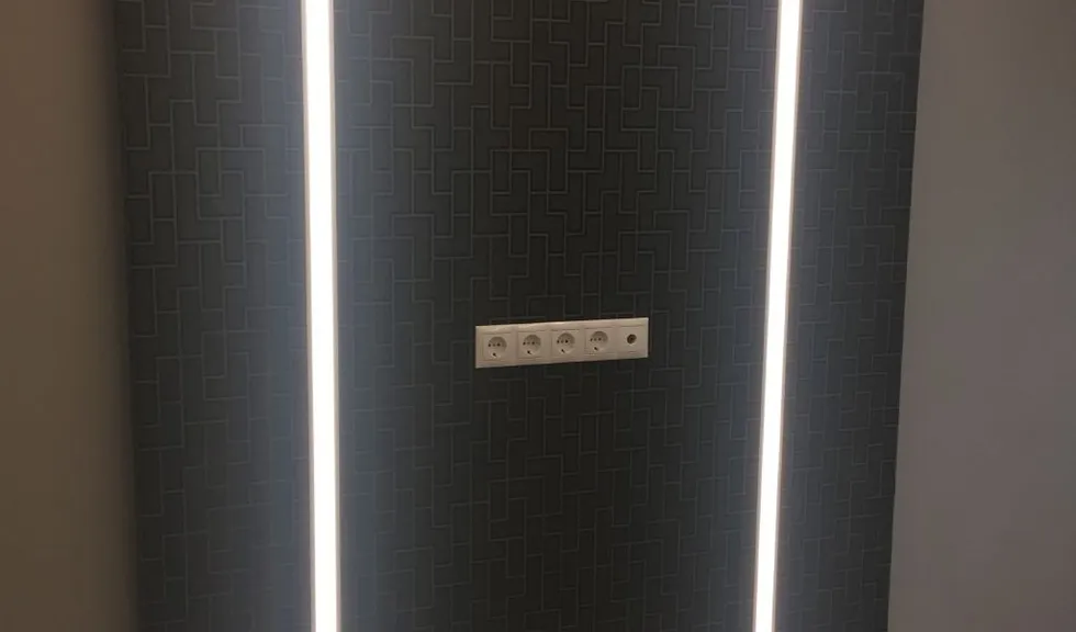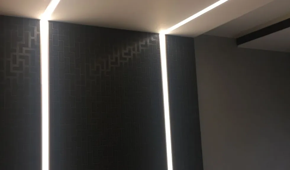 Но, пожалуй, самое интересное - это линии света. Они были созданы на кухне и в одной из комнат. Линии света служат не только в декоративных целях, но и как источник основного освещения. Они представляют собой алюминиевый профиль со светодиодной лентой, установленной внутри, и закрытой белым матовым светопропускающим экраном. В комнате линии света выглядят особенно эффектно - благодаря переходу с потолка на стену без стыков они смотрятся цельно.
