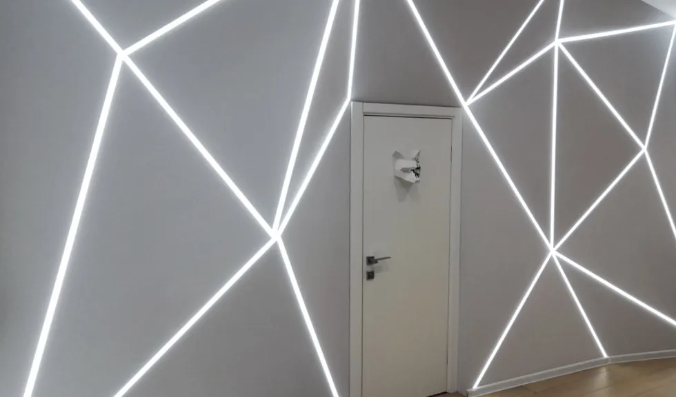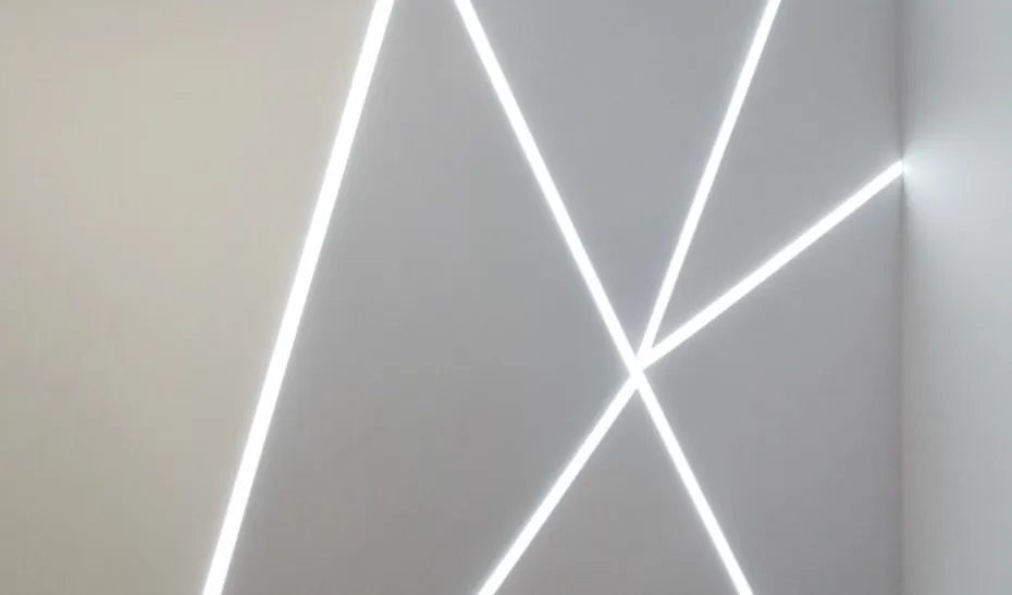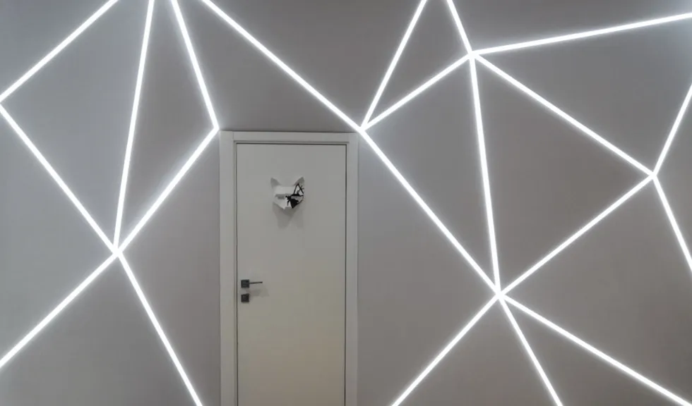 Удивительная игра света, создающая объемное изображение на абсолютно гладкой стене. Световые линии разной длины расположены на поверхности под определенным углом и создают на стене иллюзию объемной полусферы. Проект с необычной геометрией и строгой красотой реализован с минимальным количеством светотехнического оборудования — профилем и лентой.